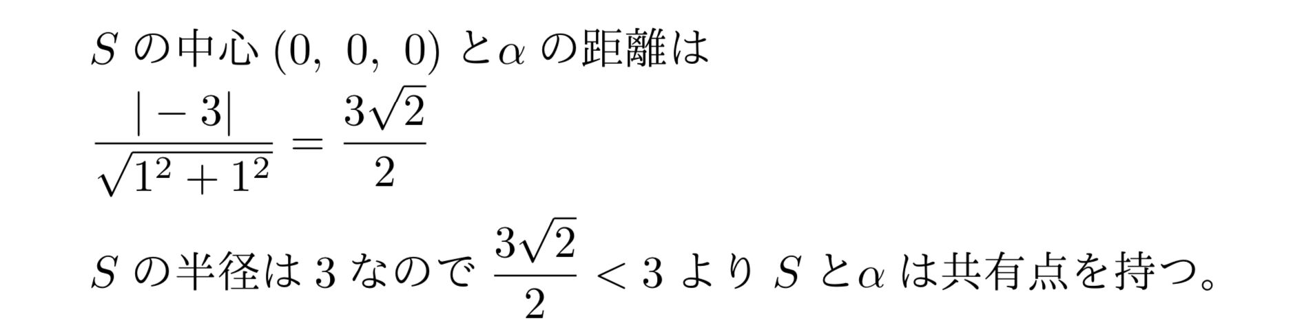 球と平面が共有点を持つかという問題ですが、模範解答としては球(S)の中心(0, 0, 0)と平面の距離が球の半径よりも短いので共有点を持つとすれば良いです。点と平面の距離の公式についてはこちらのブログをどうぞ。