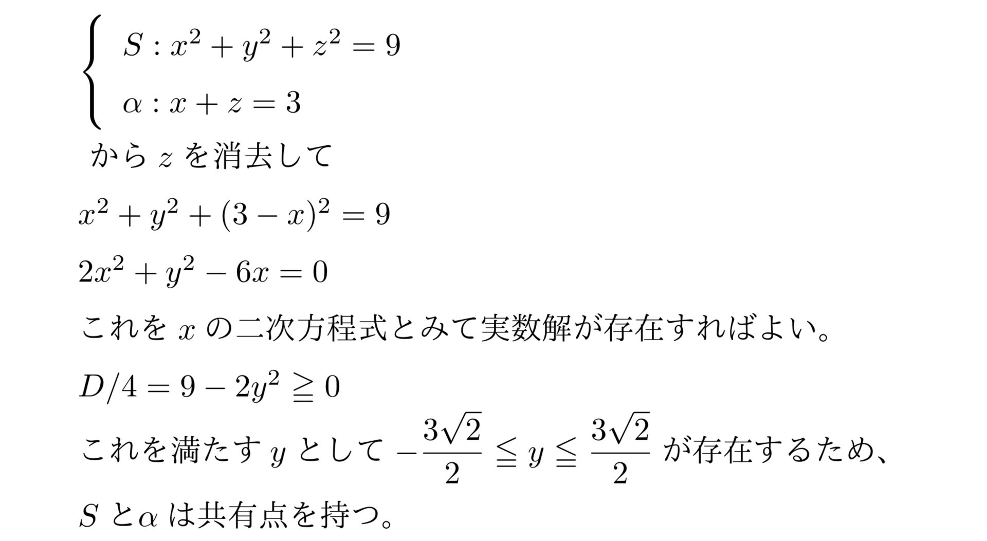 「S : x2+y2+z2=9とα: x+z=3は共有点を持つか」