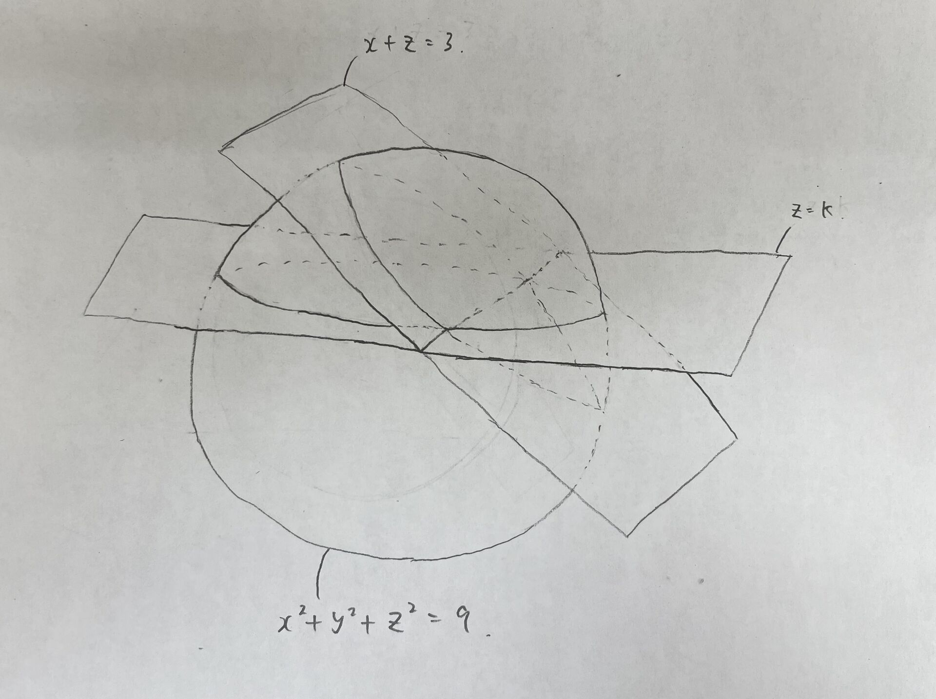 k(=z)を消去した式(x2+y2+(3-x)2=9)で表されるグラフはこの二点を含むことになります(直線束や円束と同じ考えです)。また二つの式からkを消去することで一つの式にしたので条件が一つ減少してしまっていますが、この式とx+k=3という二つの式で考えれば、この2つの交点の座標が求まることになります(A=0、B=0と同値な条件はA-B=0、A=0などがあります)。