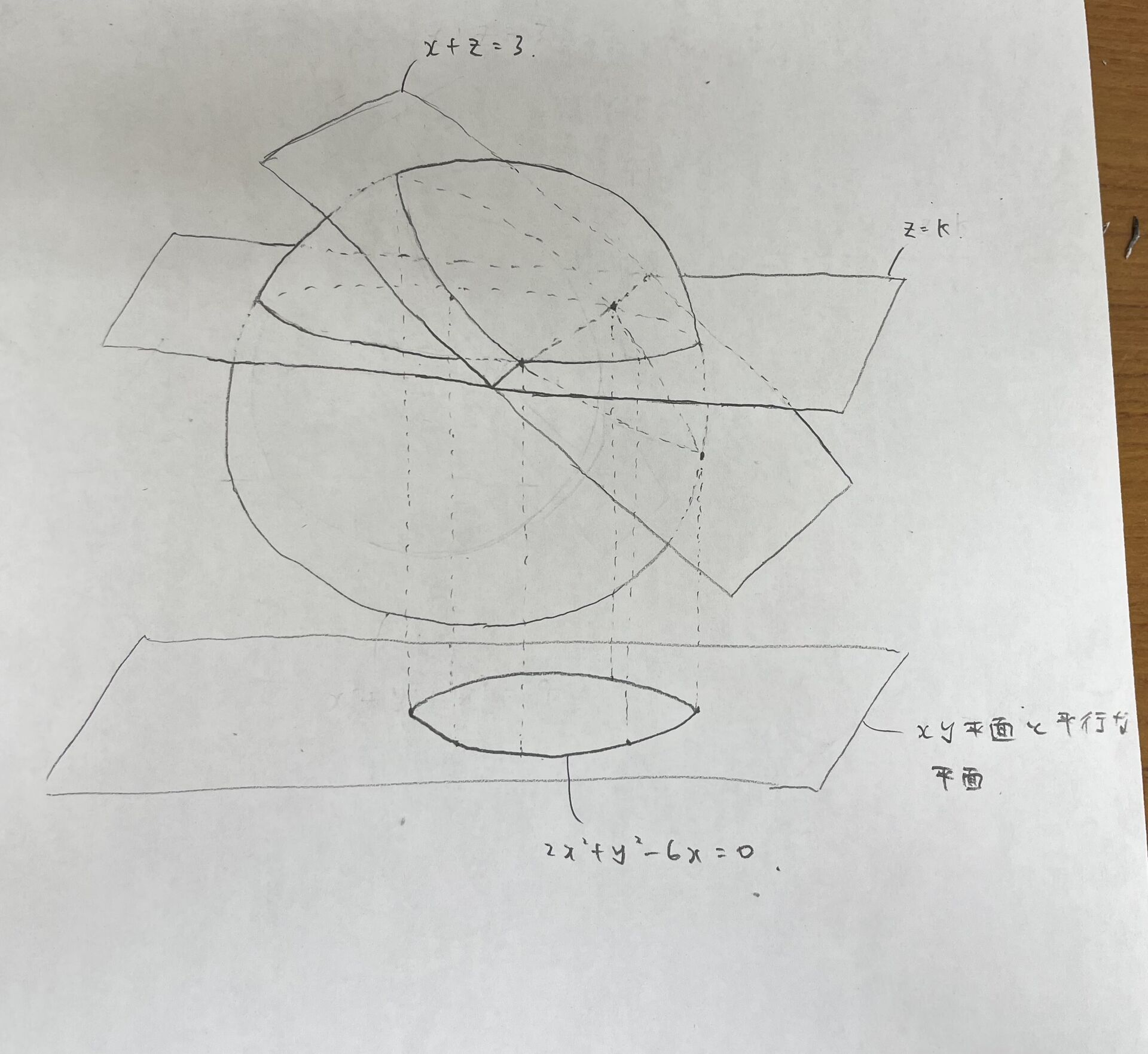 このとき、z=kをkの値を変化させて上下に動かすと生じた交点はすべて2x2+y2−6x=0上の点となっていることがわかるので、2x2+y2−6x=0がxy平面にSとαの共有点を正射影した楕円の方程式になっているようです。